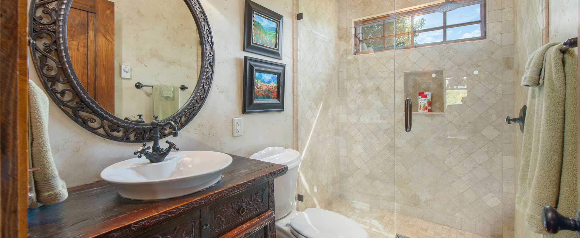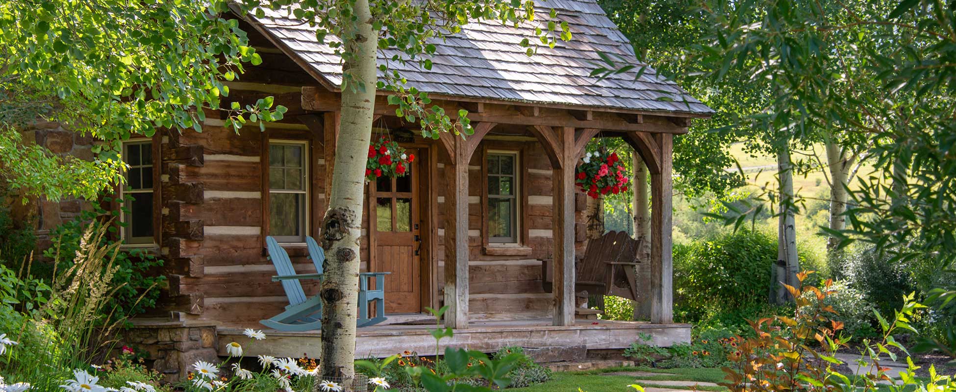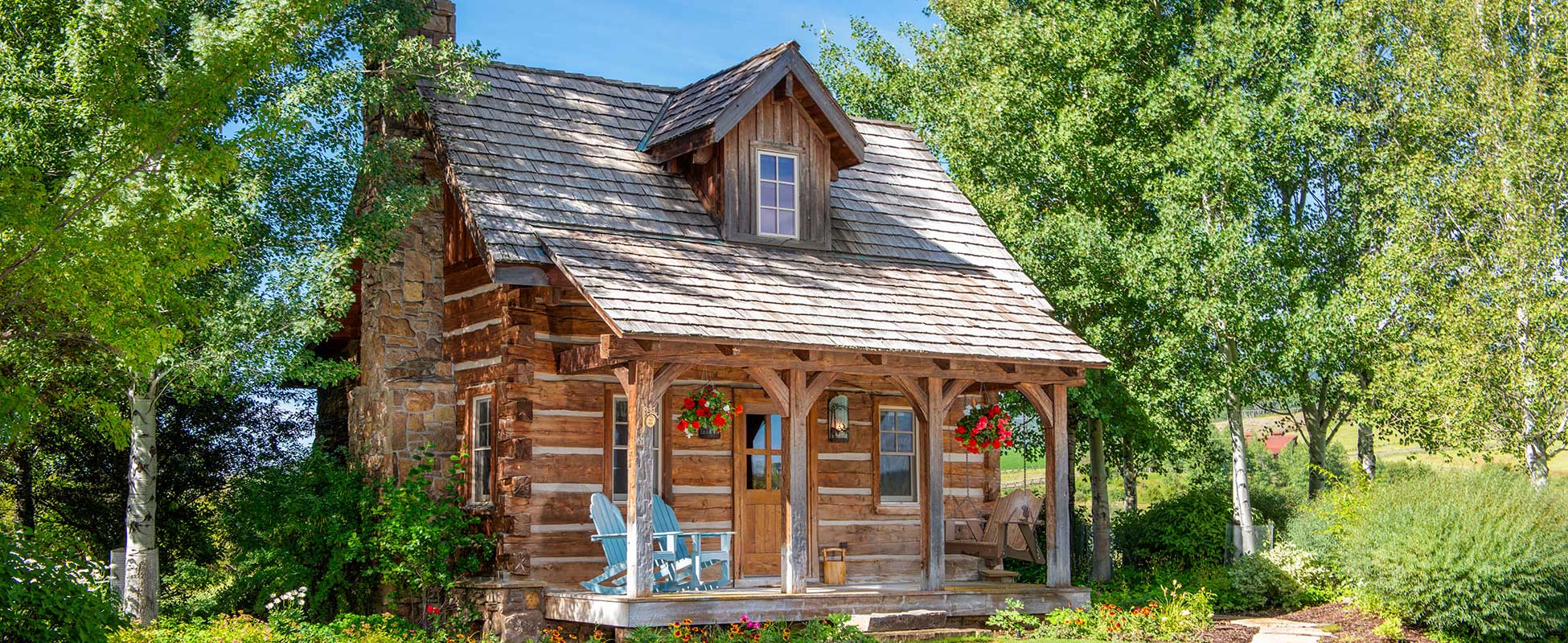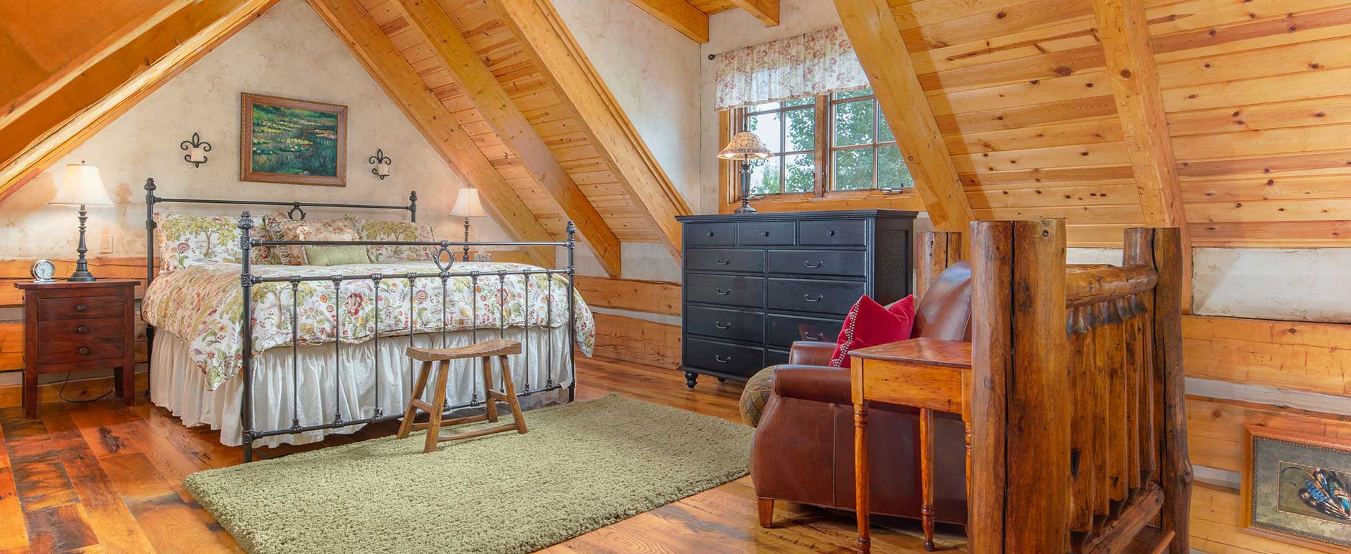 The Double L “Trappers Cabin” is 800 sq.ft of wild-west hand-hewn timbers and offers a cozy guest quarters for family or friends. It features one up-stairs spacious bedroom and an open living-dining floor plan.